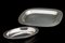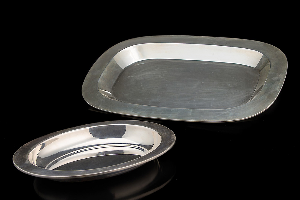 Due vassoi in argento, rispettivamente di forma rettangolare con angoli smussati e ovale, con superficie liscia. Italia, manifattura moderna (cm 45,5x31 ca.; lungh. cm 31,5 ca.) (g tot. 2100 ca.) (lievi difetti)