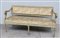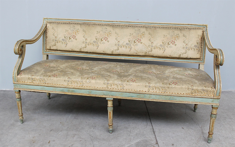 Divano "Luigi XVI" a tre posti in legno laccato azzurro e avorio con profili dorati. Braccioli e montanti sagomati e intagliati. Piedi torniti e scanalati. Sec. XIX (difetti)