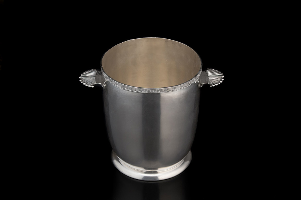 Secchiello porta champagne in argento di forma cilindrica con superficie liscia, bordura a conchiglie fogliate e prese ad orecchia. Milano, metà secolo XX, argentiere Arte e Argenteria di Bulzi Desiderio (h. cm 21,5 ca.) (g 1100 ca.) (lievi difetti)