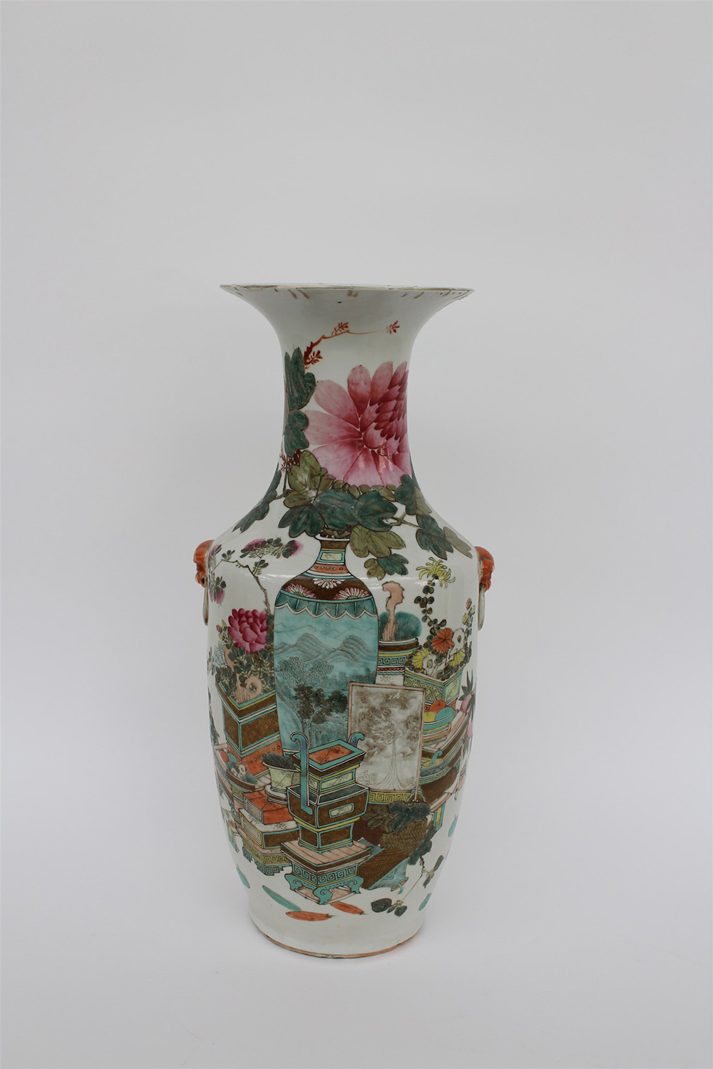 Vaso biansato in porcellana a smalti policromi decorato con oggetti preziosi e rami di fiori