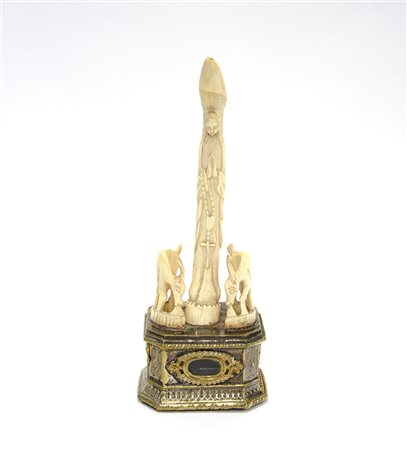 Gruppo in osso raffigurante Madonna e cerbiatti (h cm 29) base ottagonale in rame dorato e inciso (difetti)
