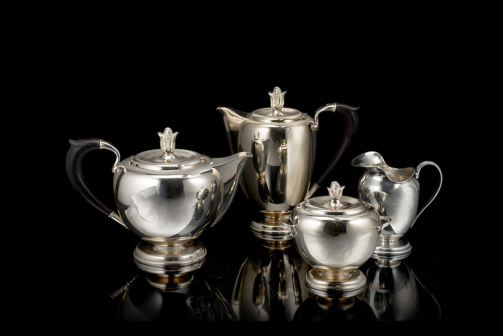 Servizio da tè e caffè in argento, di gusto decò, composto da caffettiera, teiera, lattiera e zuccheriera di forma bombata e superficie liscia; pomoli a bocciolo stilizzato e manici ad ansa in argento e legno; Alessandria, metà secolo XX, ditta Cesa (g lordi 1900 ca.) (h. max cm 20,5 ca.) (difetti)