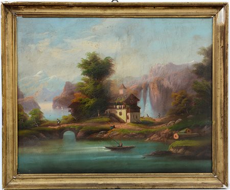 Ignoto "Paesaggio lacustre con figure" olio su tela (cm 58x75) in cornice