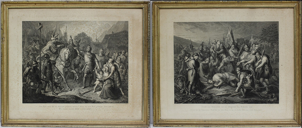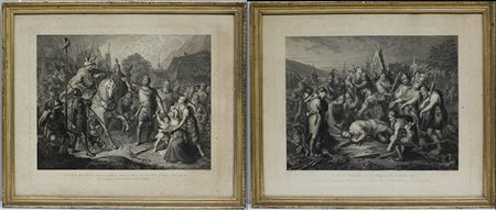 Lotto composto da due incisioni in bianco e nero (cm 45x57) raffiguranti due scene belliche ambientate nel medioevo (fioriture). In cornici (difetti).