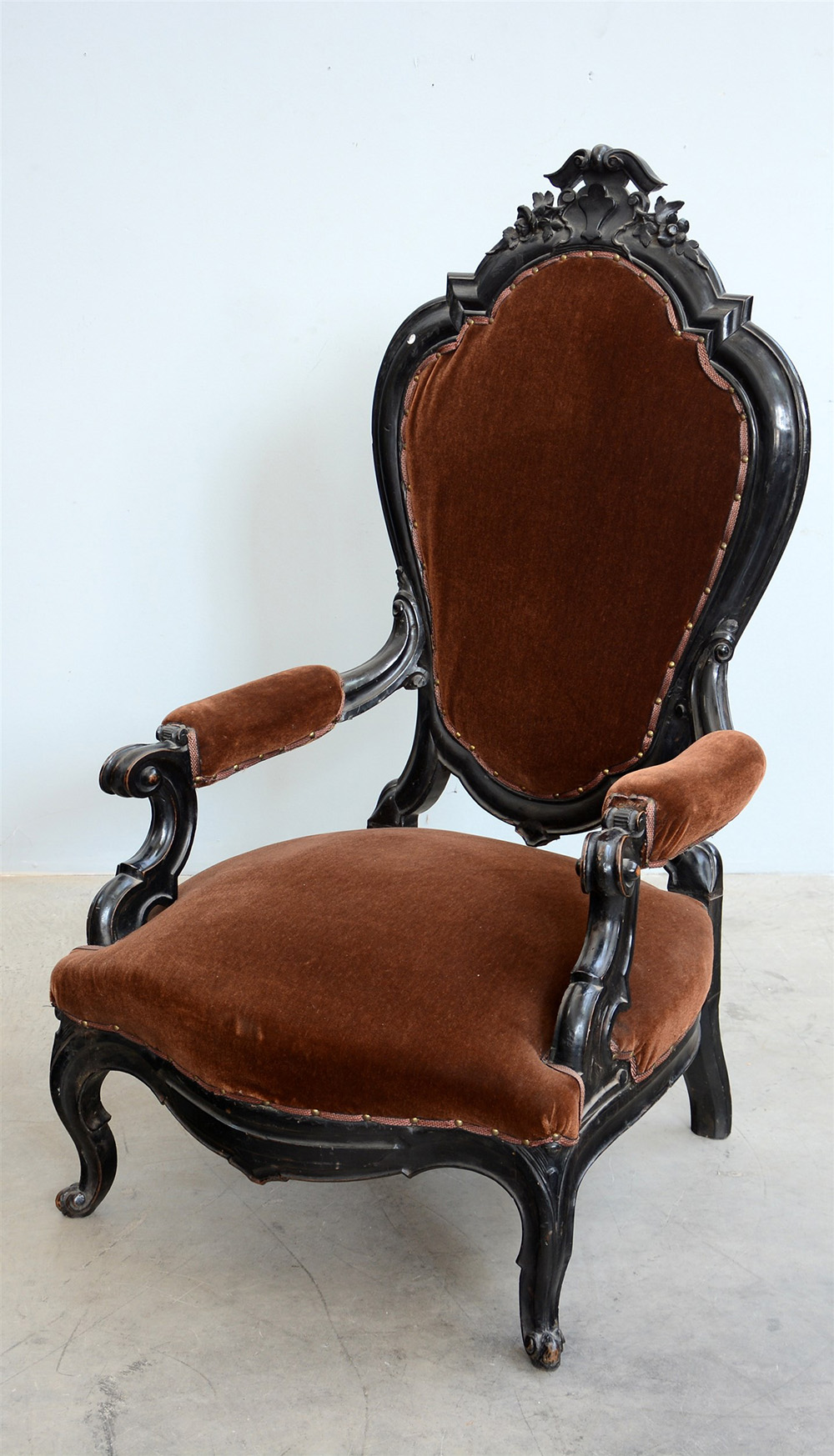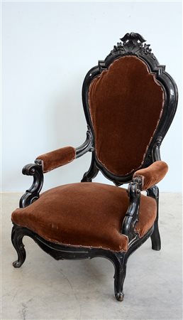 Poltrona in legno ebanizzato con schienale sagomato e intagliato a motivi veggetali, braccioli, montanti e gambe mosse. Sec. XIX (difetti)