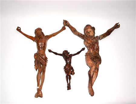 Lotto di tre sculture in legno intagliato raffiguranti Cristo crocifisso, epoche e misure diverse (difetti e restauri)