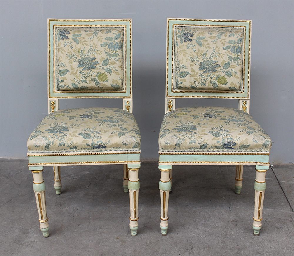 Coppia di sedie "Luigi XVI" in legno laccato azzurro e avorio con profili dorati, gambe tornite e scanalate