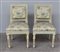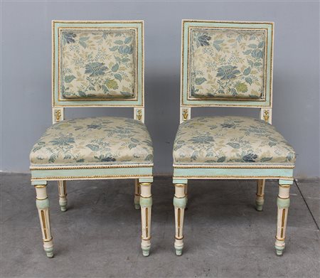 Coppia di sedie "Luigi XVI" in legno laccato azzurro e avorio con profili...