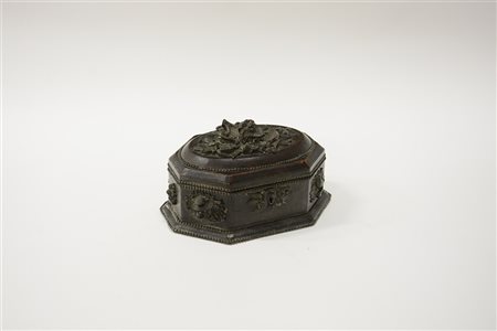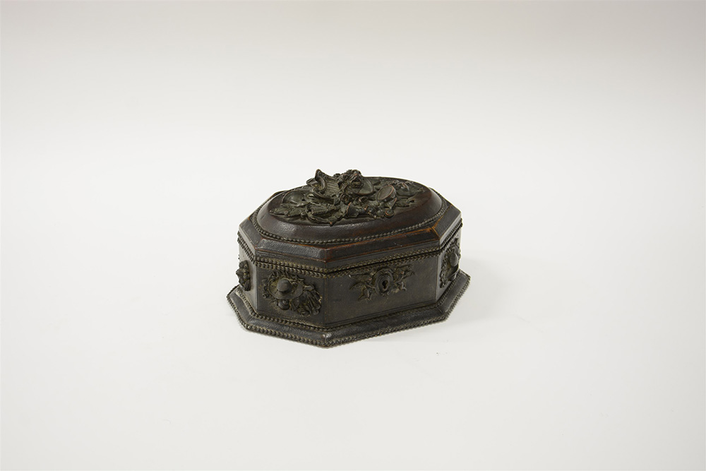 Cofanetto portagioie di forma ottagonale in legno rivestito in cuoio e decorato con applicazioni in rame raffiguranti putti alati, personaggi e composizioni con fiori e strumenti musicali (cm 28x9x16) sec. XIX (difetti)