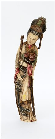 Dama con ramo di fiori (h. 40 cm.) in avorio colorato(difetti) Cina, sec. XX-EN.