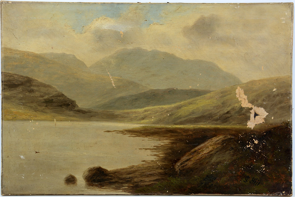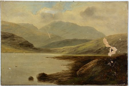 Firma indecifrata "Paesaggio lacustre" olio su tela (cm 50x78) firmato in basso a destra (gravi difetti)