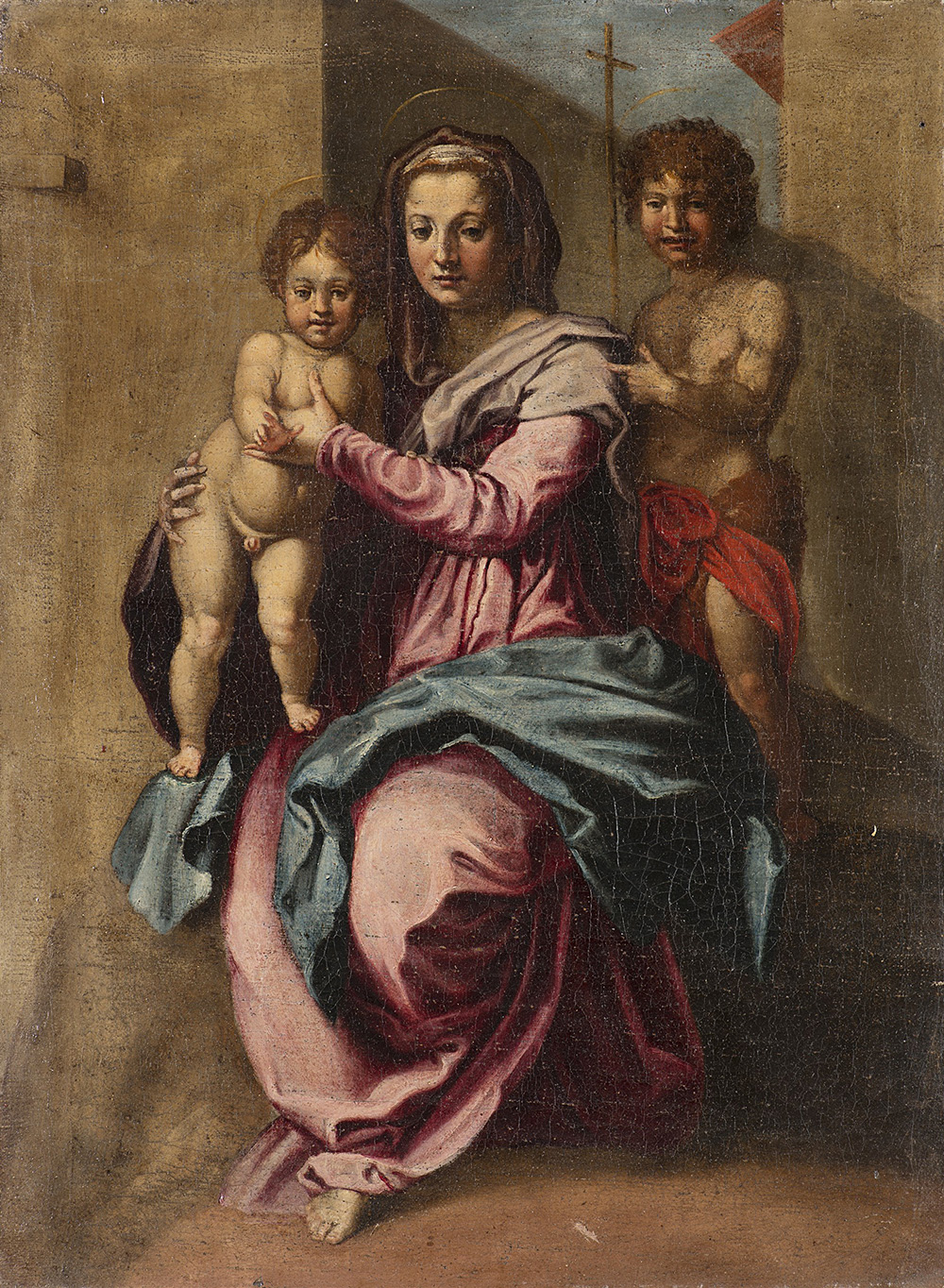 "Madonna con Bambino e San Giovannino" olio su tela (cm 58x43). In cornice. Al retro timbro a ceralacca con iscrizione: "Collection L. Mairet"
