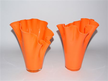 Lotto composto da due vasi a fazzoletto in vetro di color arancio, misure...