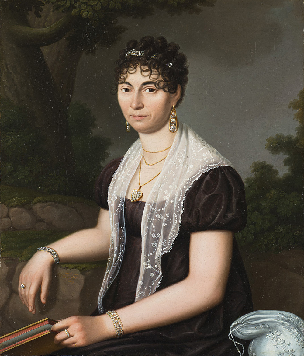 "Lady with tiara in a landscape, 1809" oil on canvas (cm 56x47,5) Signed and dated bottom left. Framed (restorations)
