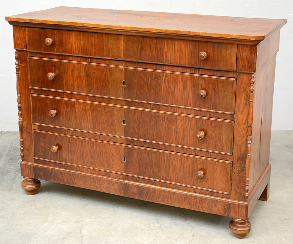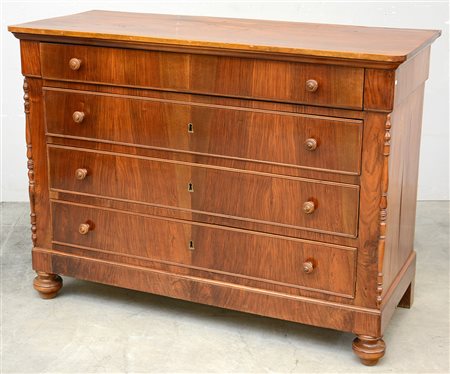 Comò a quattro cassetti con pomoli in legno e piedi a cipolla, secolo XX (cm 127x94x54) (difetti)