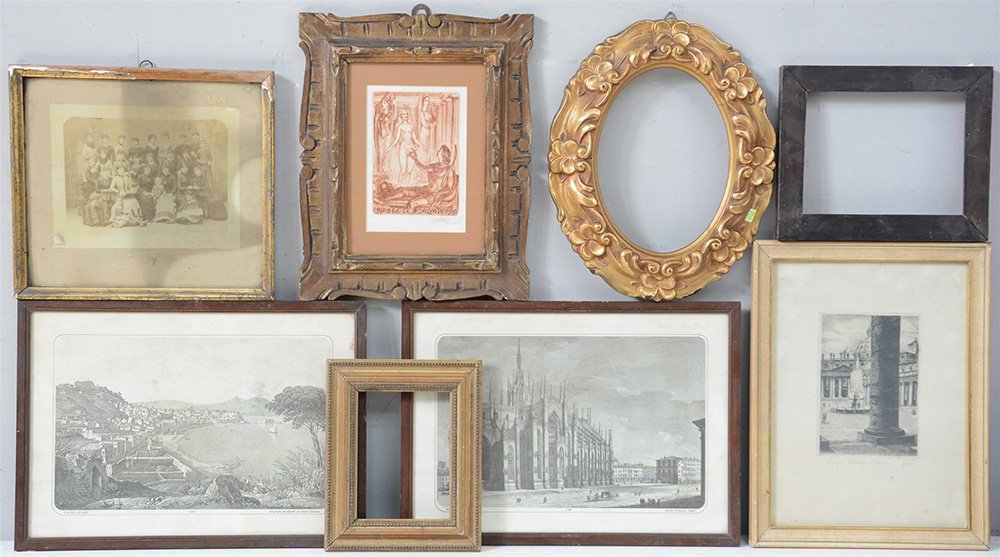 Lotto composto da otto piccole cornici di misure diverse, alcune contenenti stampe (difetti)