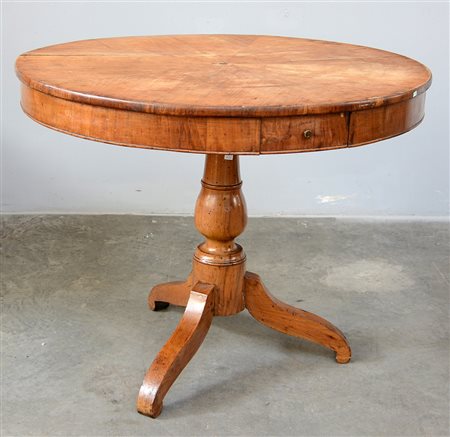 Tavolo tondo con piano lastronato in noce e filettato, cassetto nella fascia, gamba centrale tornita terminante a tre piedi sagomati, secolo XIX (d cm 96x h cm 78)(difetti e restauri)