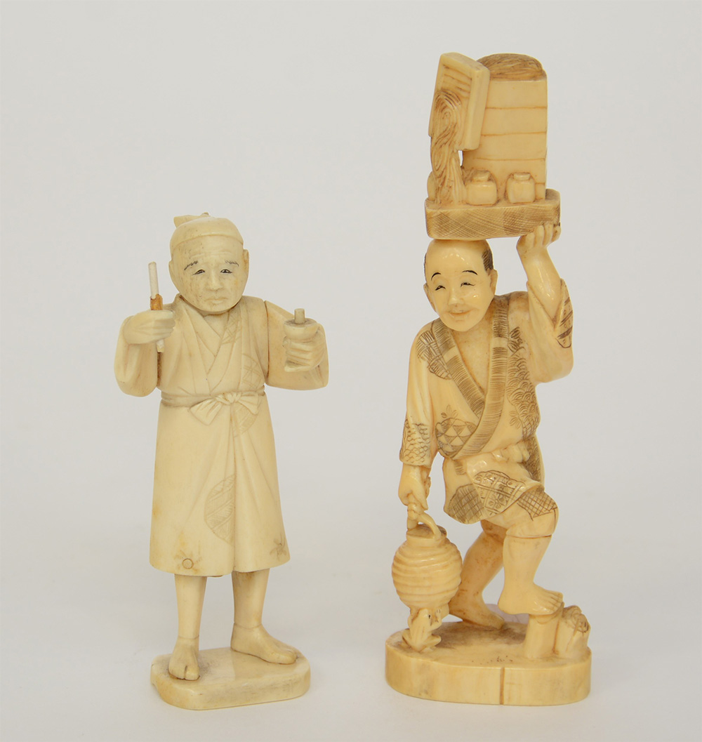 Due okimono raffiguranti figure maschili, uno firmato alla base (difetti)
