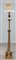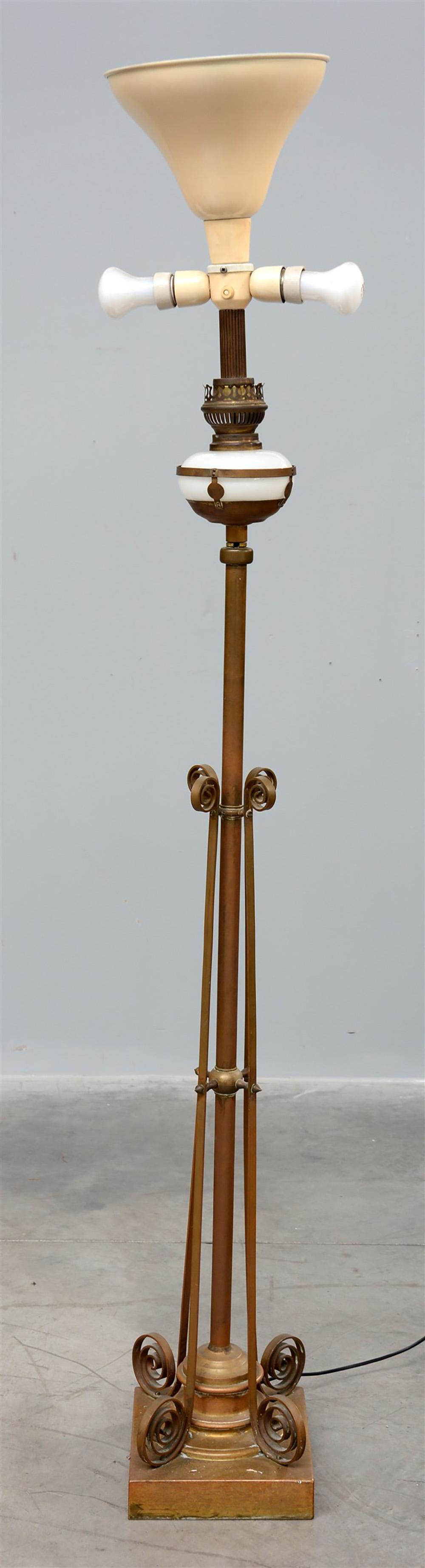 Lampada da terra in metallo dorato, elementi decorativi terminanti a ricciolo, finto serbatoio per l'olio in vetro lattimo (h cm 180) (difettI)