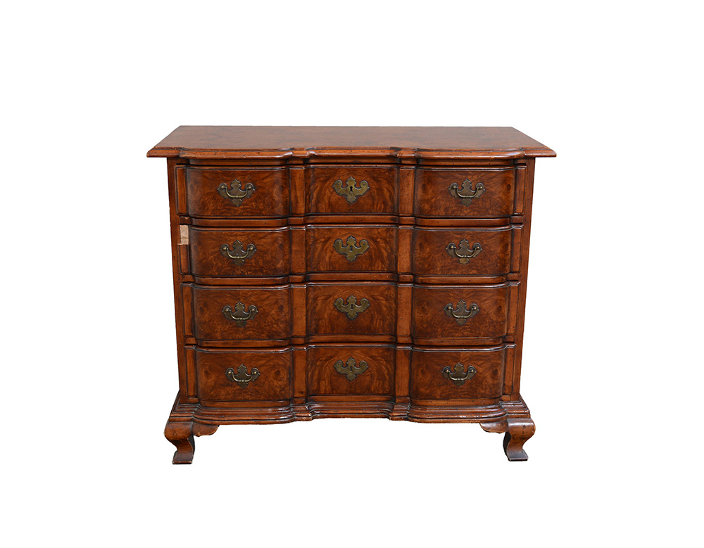 Comò in radica con fronte mosso a tre cassetti, maniglie e bocchette in bronzo (cm 106x91x50) (lievi difetti e mancanze)