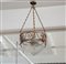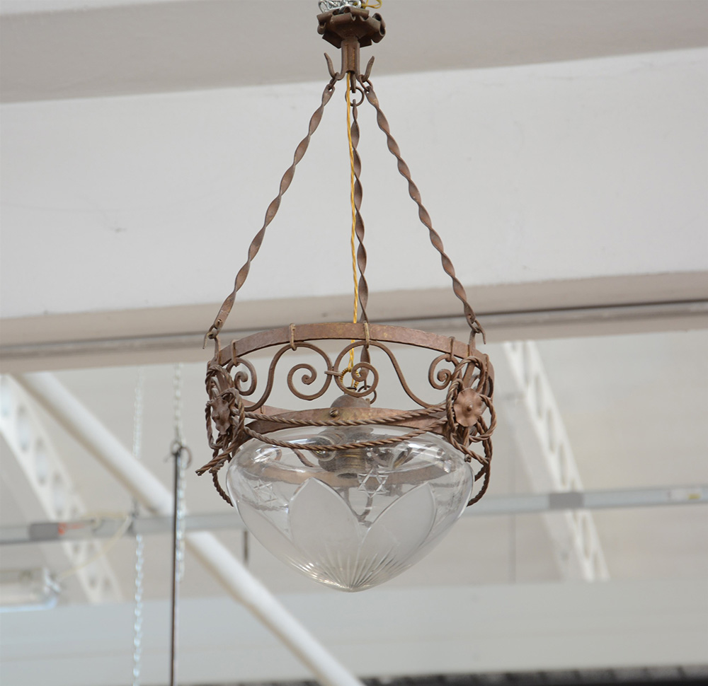 Lampada da esterno a sospensione a tre luci. Struttura in ferro battuto e paralume in vetro molato.