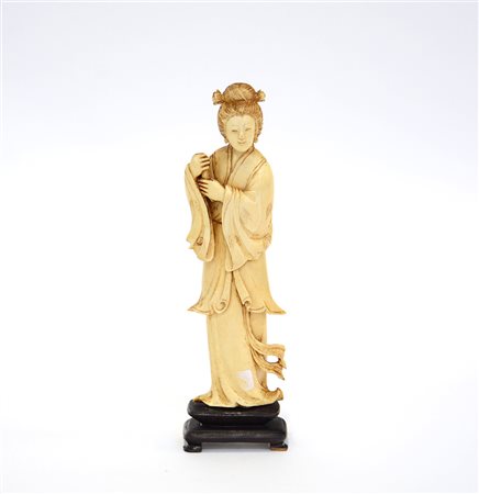 Scultura in avorio raffigurante dama dalle lunghe vesti con base in legno...