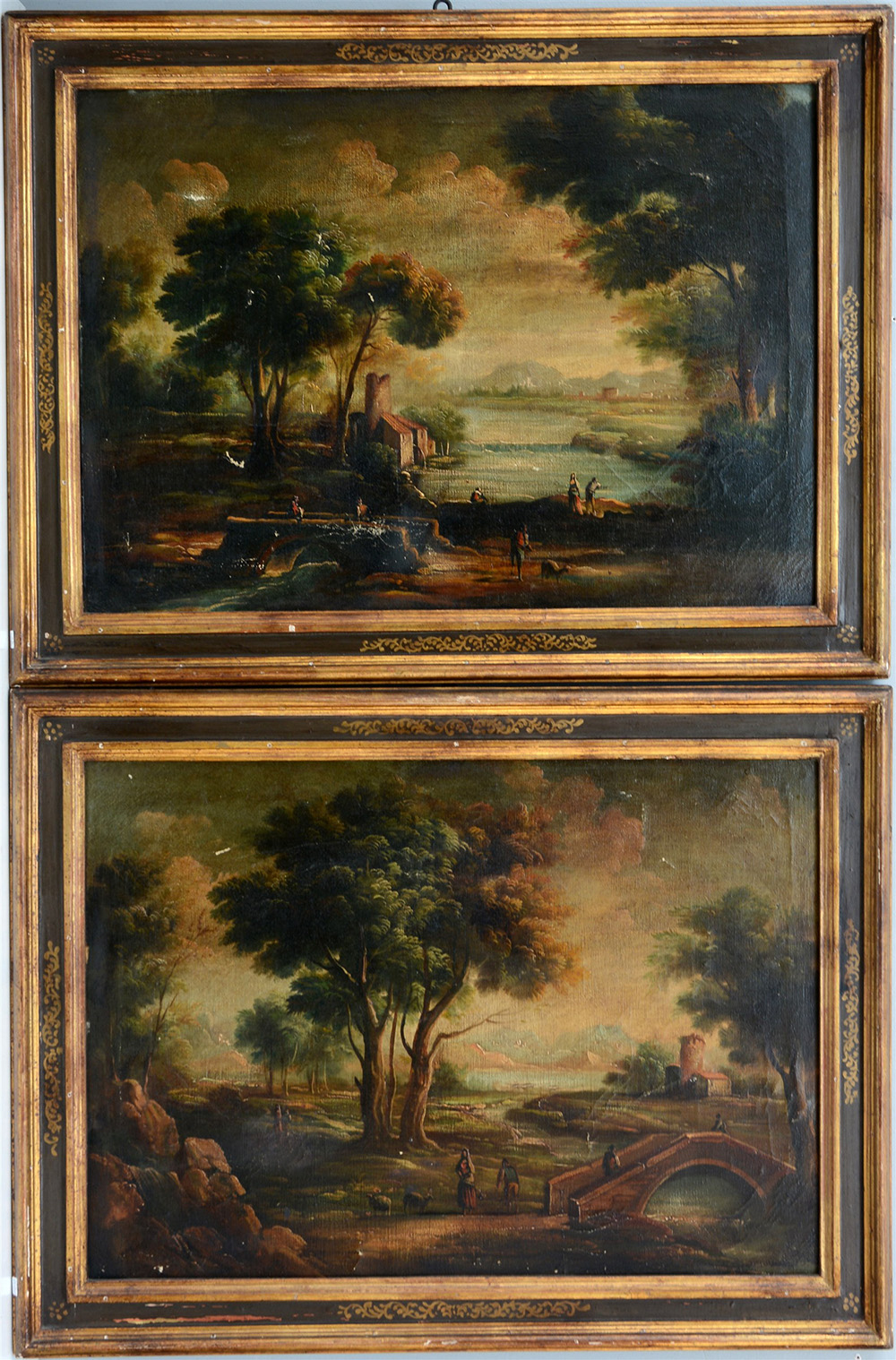 Ignoto "Paesaggi fluviali con figure" coppia di olii su tela (cm 50x70) in cornici (difetti)