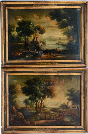 Ignoto "Paesaggi fluviali con figure" coppia di olii su tela (cm 50x70) in...