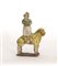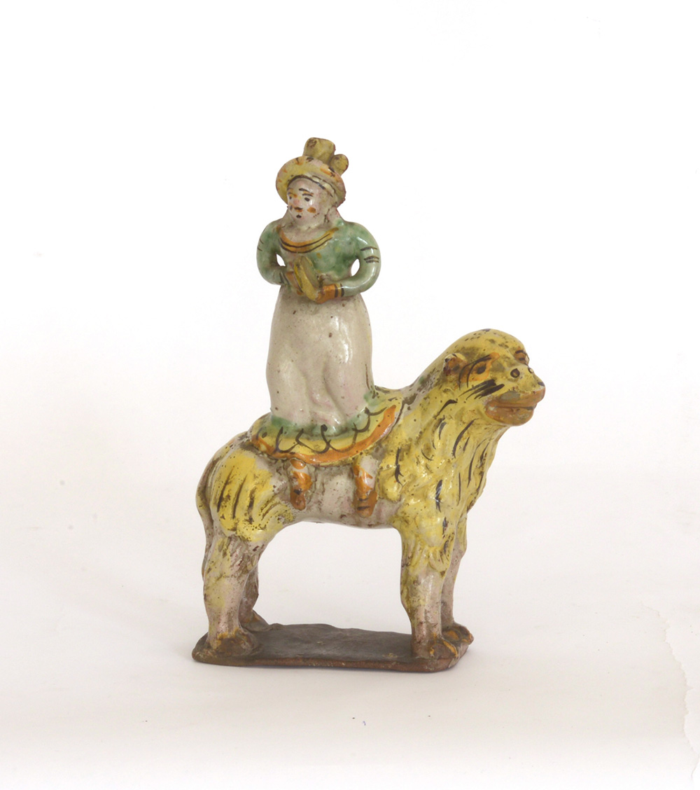 Leone con acrobata in maiolica smaltata in giallo, verde e marrone. Italia Meridionale (cm 27) (difetti)