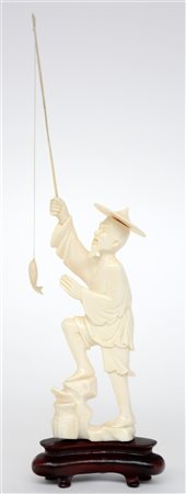 Figura di pescatore in avorio con base in legno (lievi difetti) (h. 21,5 cm.)...
