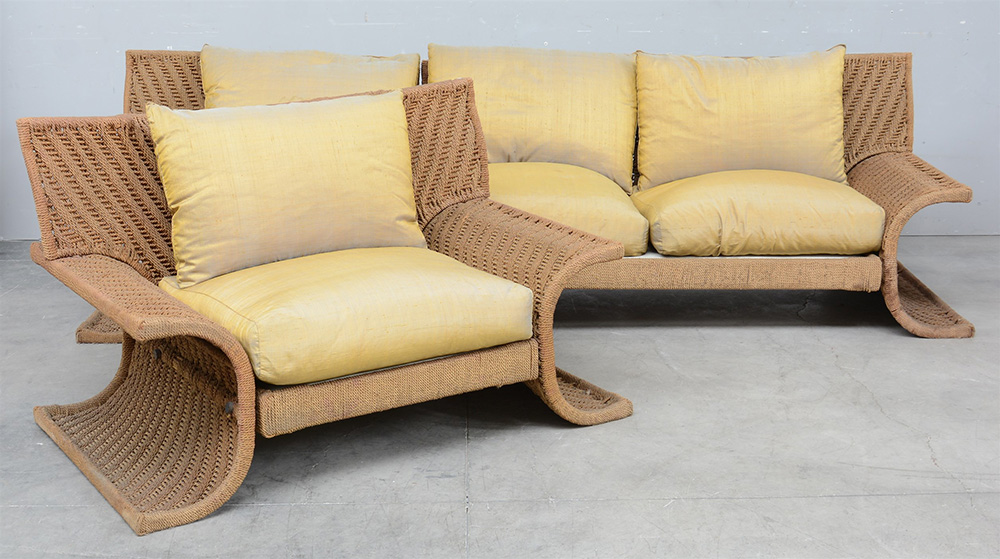 Forinitura composta da un divano a tre posti e una poltrona in cordone di passamaneria intrecciato e con struttura metallica e borchie di fissaggio in ottone tornito. Italia, anni 70 (rispettivamente cm 261x79x89 e cm 124x79x80) (difetti)