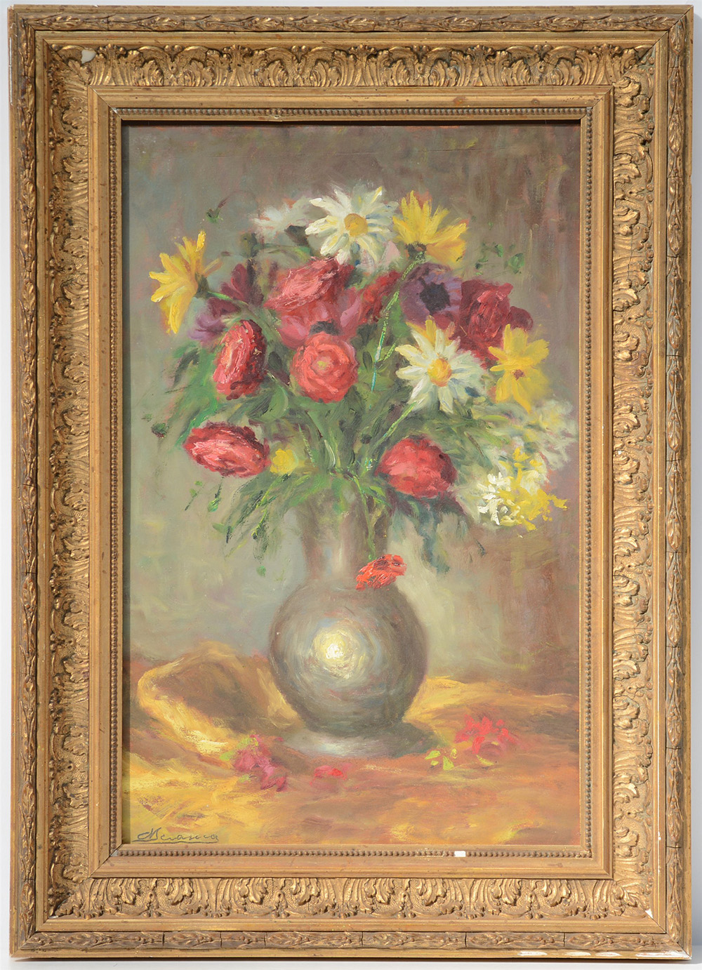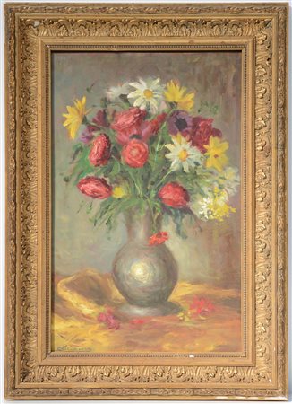 Firma indecifrata "Vaso con fiori" olio su compensato (cm 48x30) firmato in basso a sinistra, in cornice