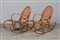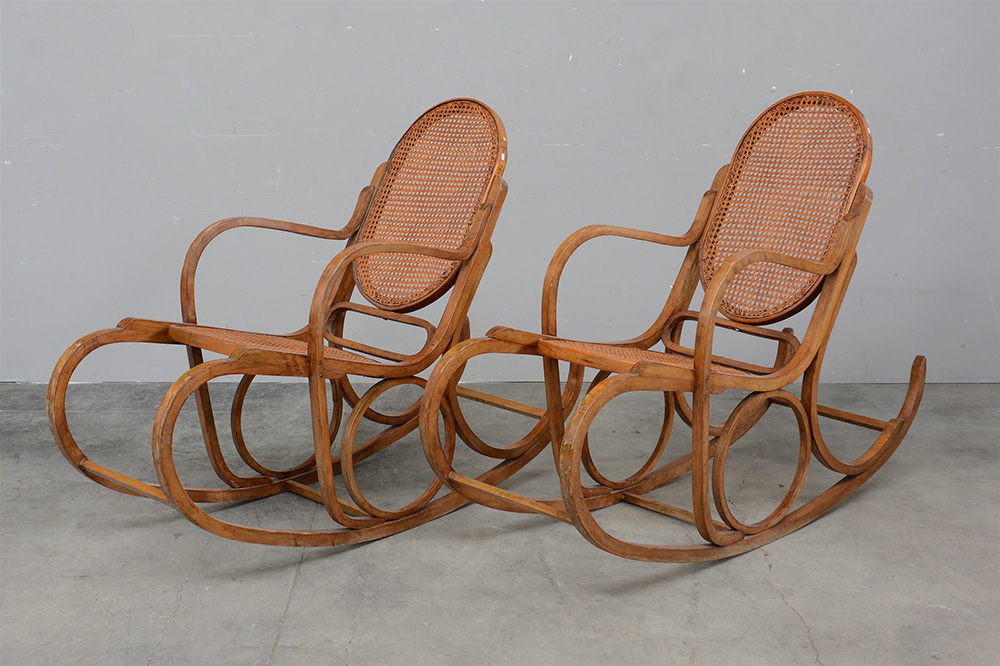 Coppia di sedie a dondolo in faggio curvato con seduta e schienale in paglia di Vienna. Produzione centro europea, prima metà del sec XX (cm 136x102x46) (lievi difetti e restauri)