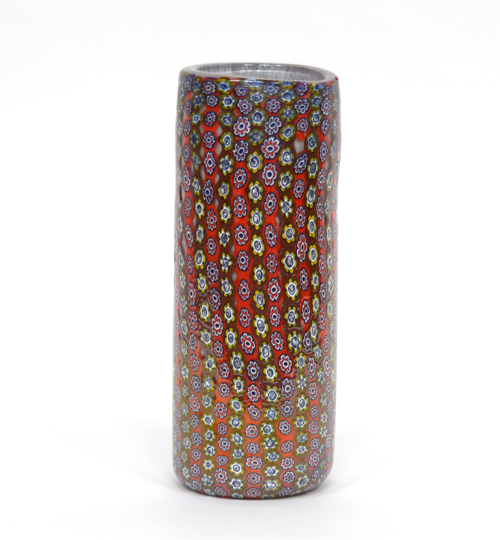 Manifattura di Murano, vaso cilindrico a murrine "millefiori". Produzione recente (h cm 32)