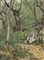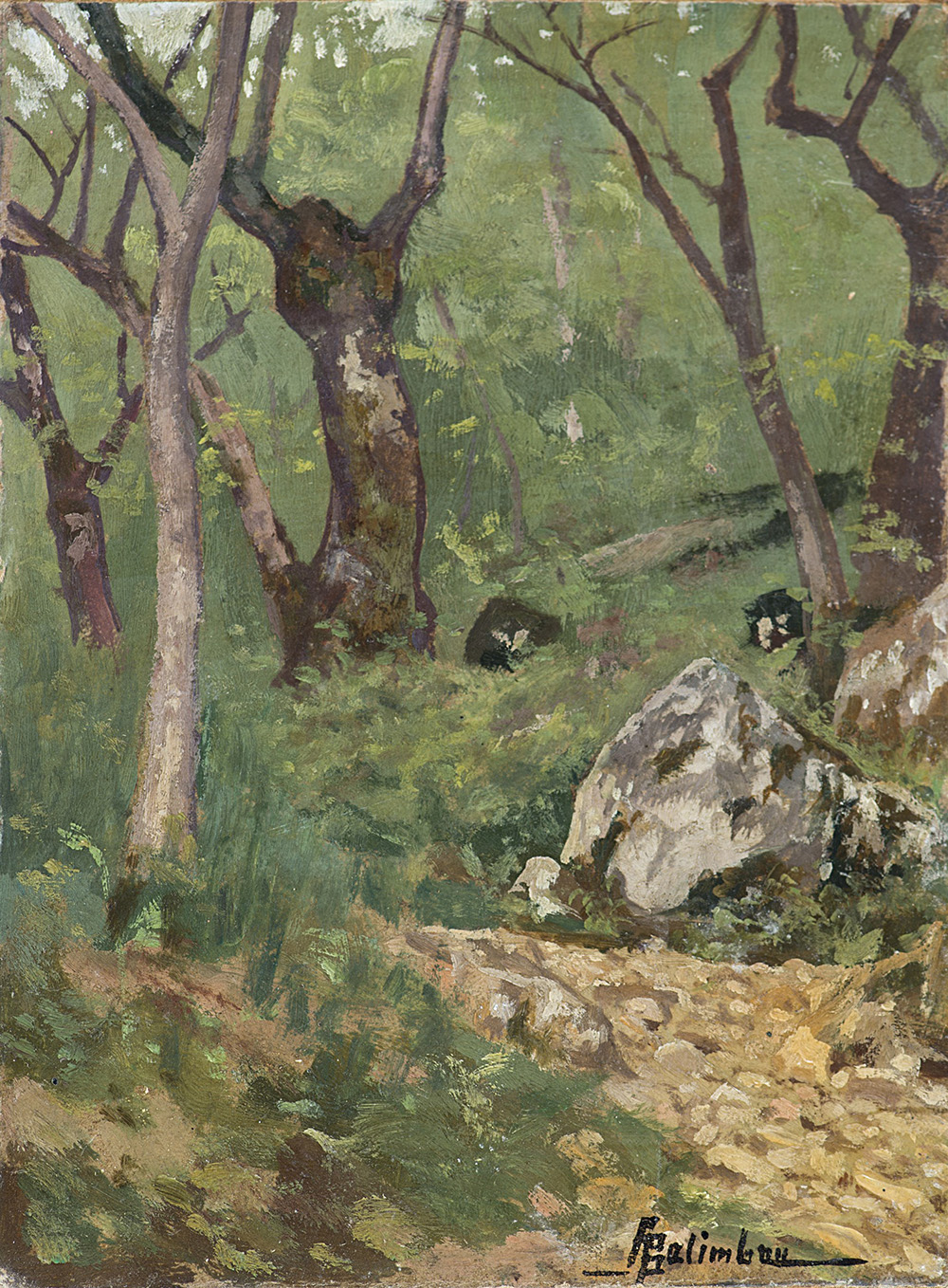 Firma indecifrata “Paesaggio boschivo” olio su cartone pressato (cm 16x12) Firmato in basso a destra. In cornice (difetti)