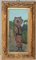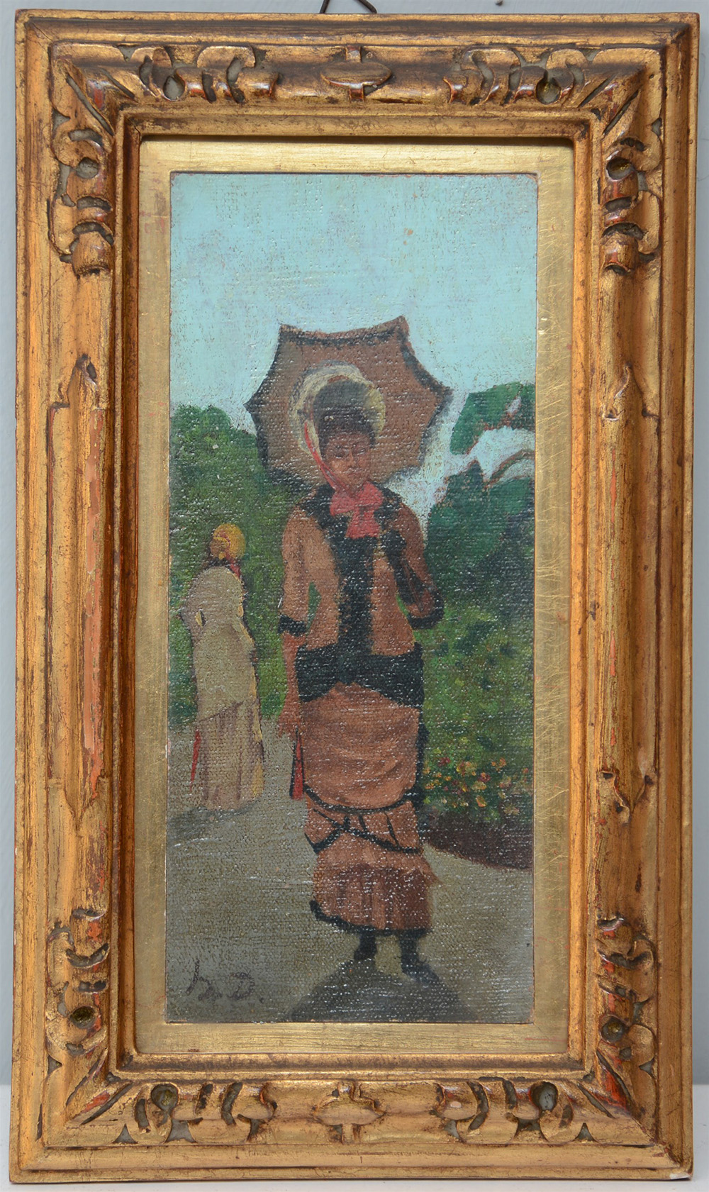 Ignoto "Donna con ombrello" olio su tela applicata a cartone (cm 23x9,5) Siglato in basso a sinistra. In cornice