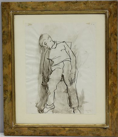 Firma indecifrata "Adolescente seduto" disegno a china su carta (cm 29x22) firmato in basso a destra e datato 1957, in cornice (difetti)