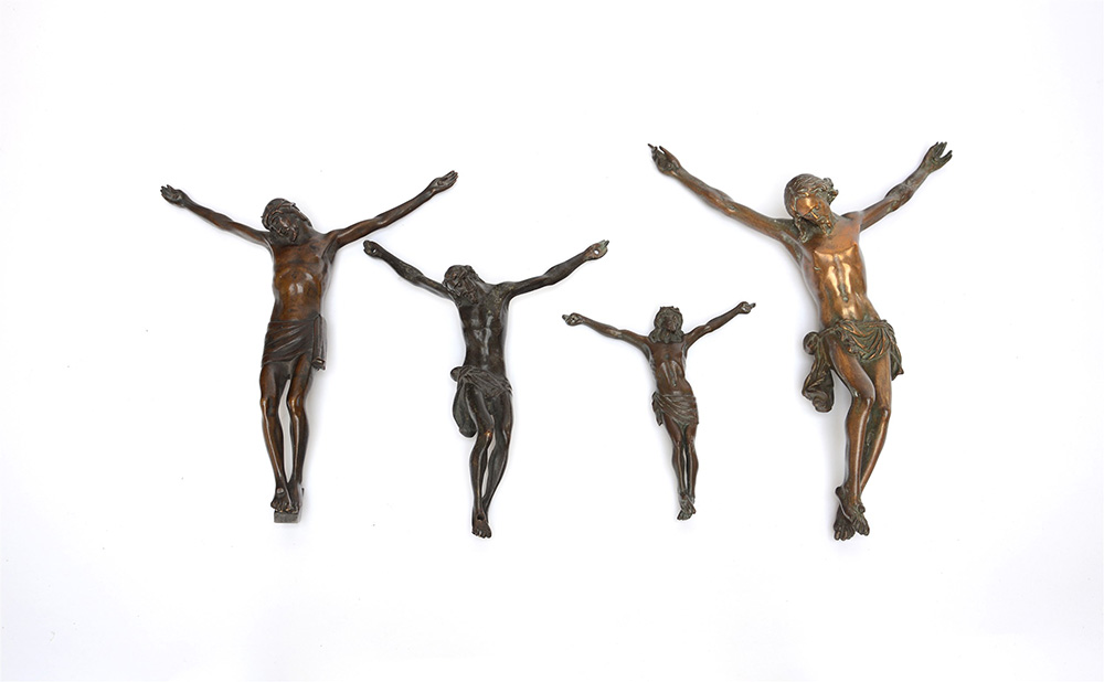 Gruppo di quattro sculture in bronzo raffiguranti Cristo crocifisso, misure ed epoche diverse (difetti)