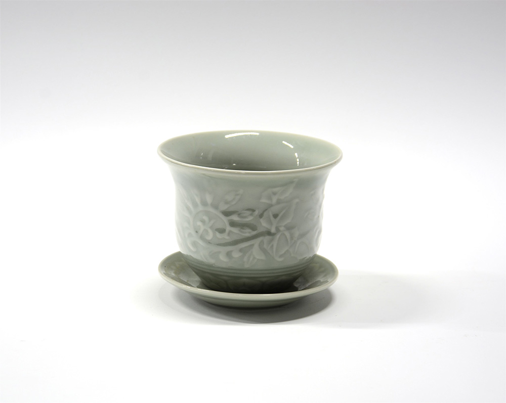 Manifattura Cina, piccolo cache-pot con piattino in porcellana verde celandons (d cm 15, h cm 13)