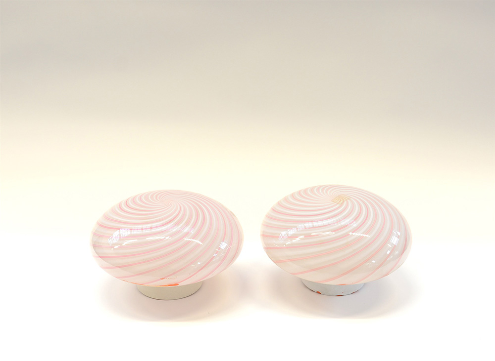 Coppia di pafoniere in vetro soffiato di Murano a canne ritorte lattimo, opalescenti e rosa (d cm 25)