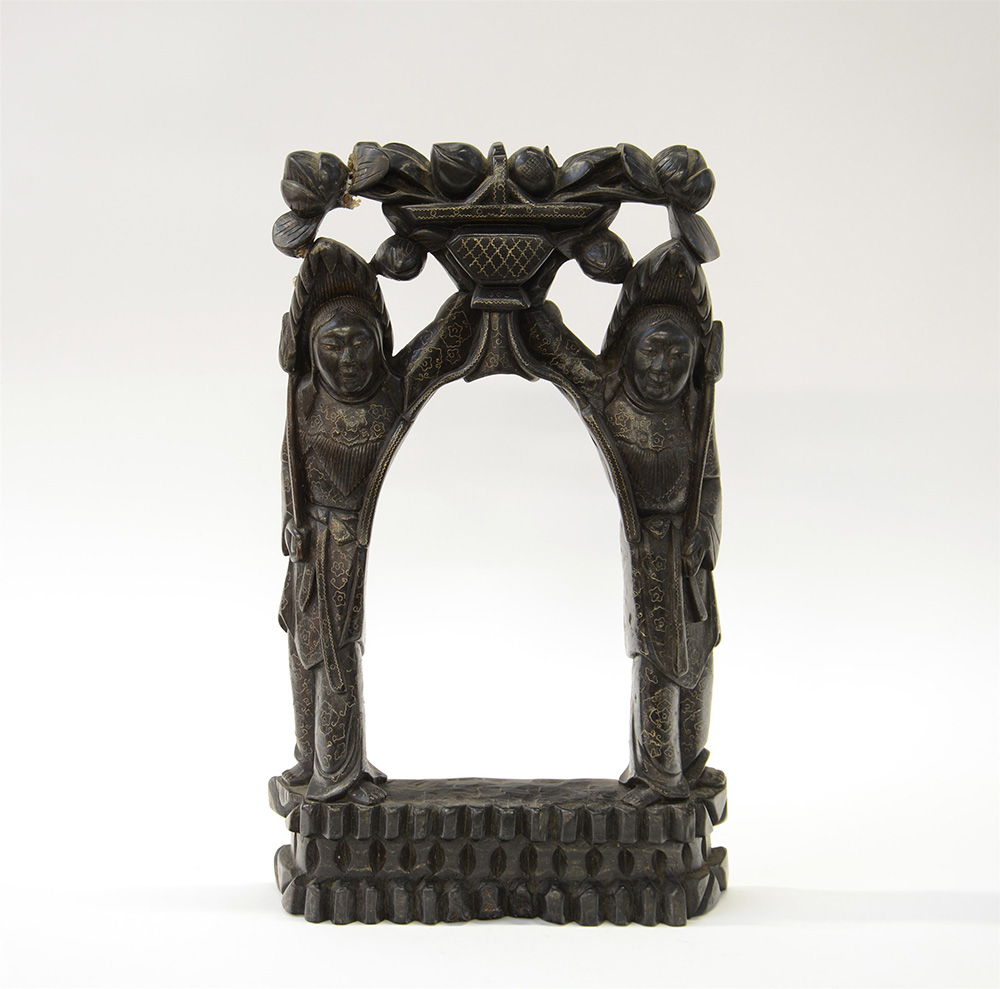 Cornice orientale porta gong in ebano a tempietto scolpita a figure e frutti (cm 43x29) (difetti)