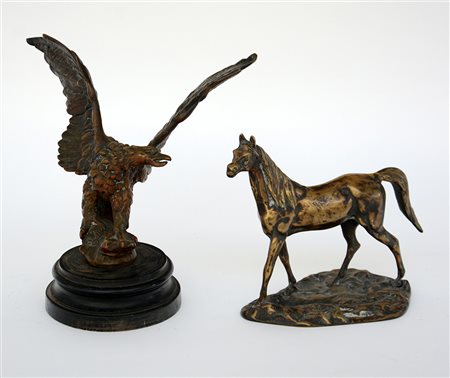 Lotto composto da due sculture in metallo raffiguranti aquila e cavallo (difetti)