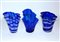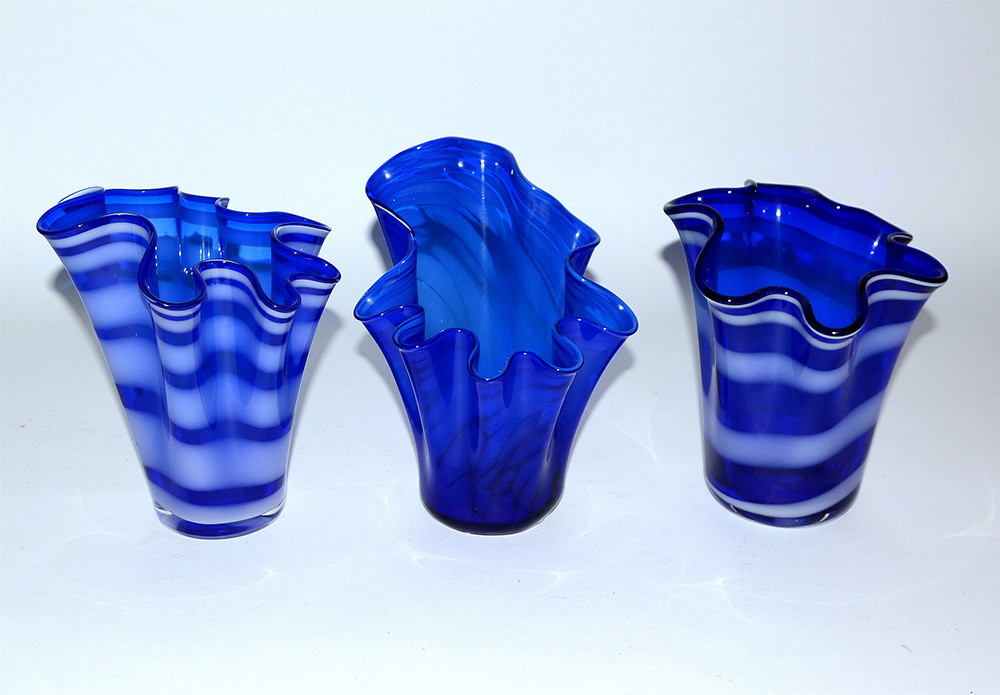 Lotto composto da tre vasi a fazzoletto in vetro blu decorato a striature (h...
