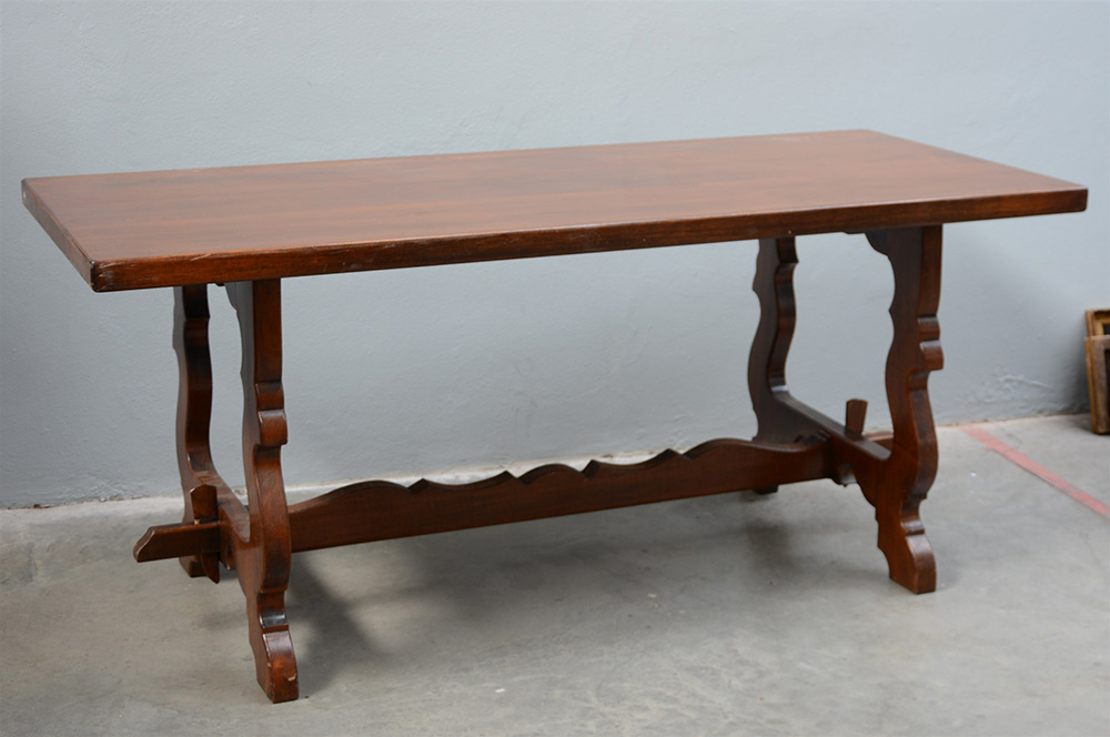 Tavolo fratino con gambe a lira riunite da traversa, sec. XX (cm 180x77x80) (lievi difetti)