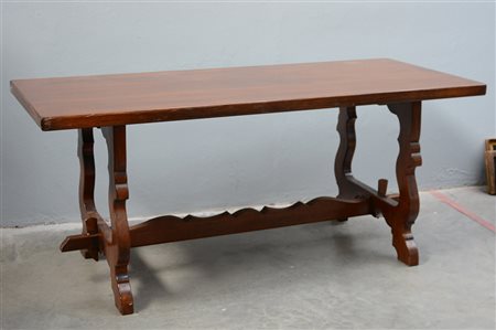 Tavolo fratino con gambe a lira riunite da traversa, sec. XX (cm 180x77x80)...