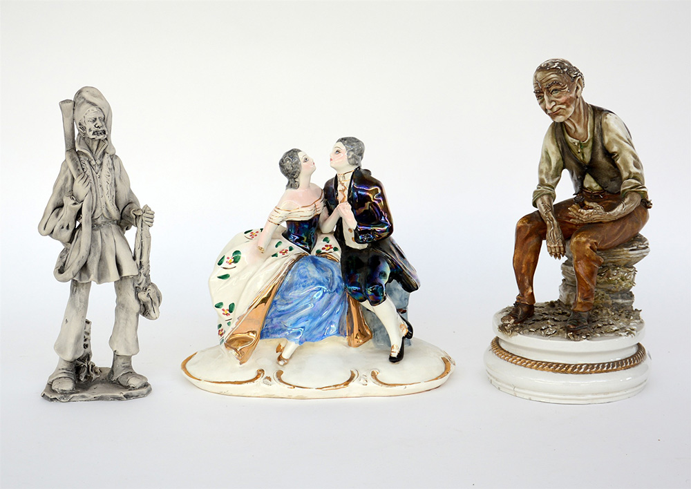 Lotto composto da tre statuette in ceramica di soggetti diversi (difetti)