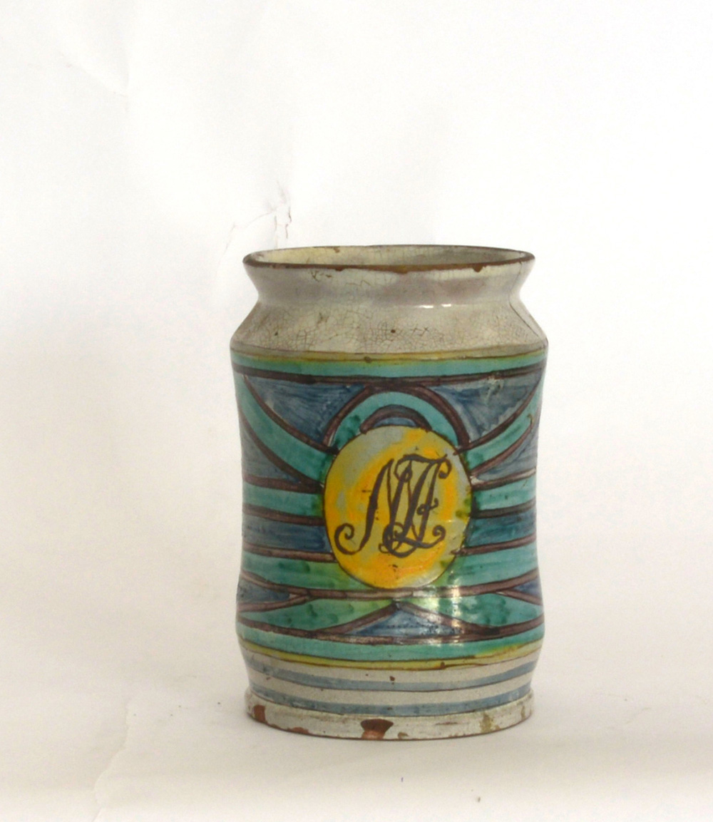 Albarello in maiolica smaltata bianca e decorato con al centro monogramma e bande di colori verde, ocra e manganese (h. cm 24)