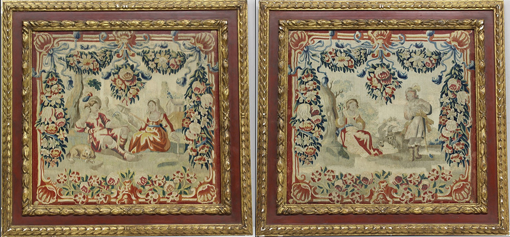 Tessuti in lana e seta raffiguranti scene galanti in paesaggio. Cornice a ghirlande e fiori policromi. (cm 55x59) (difetti e restauri)