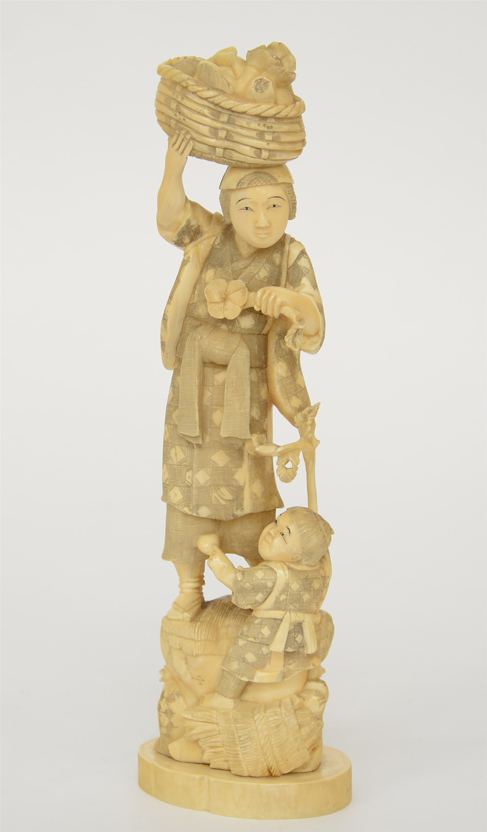 Okimono in avorio raffigurante contadina con cesta e fanciullo