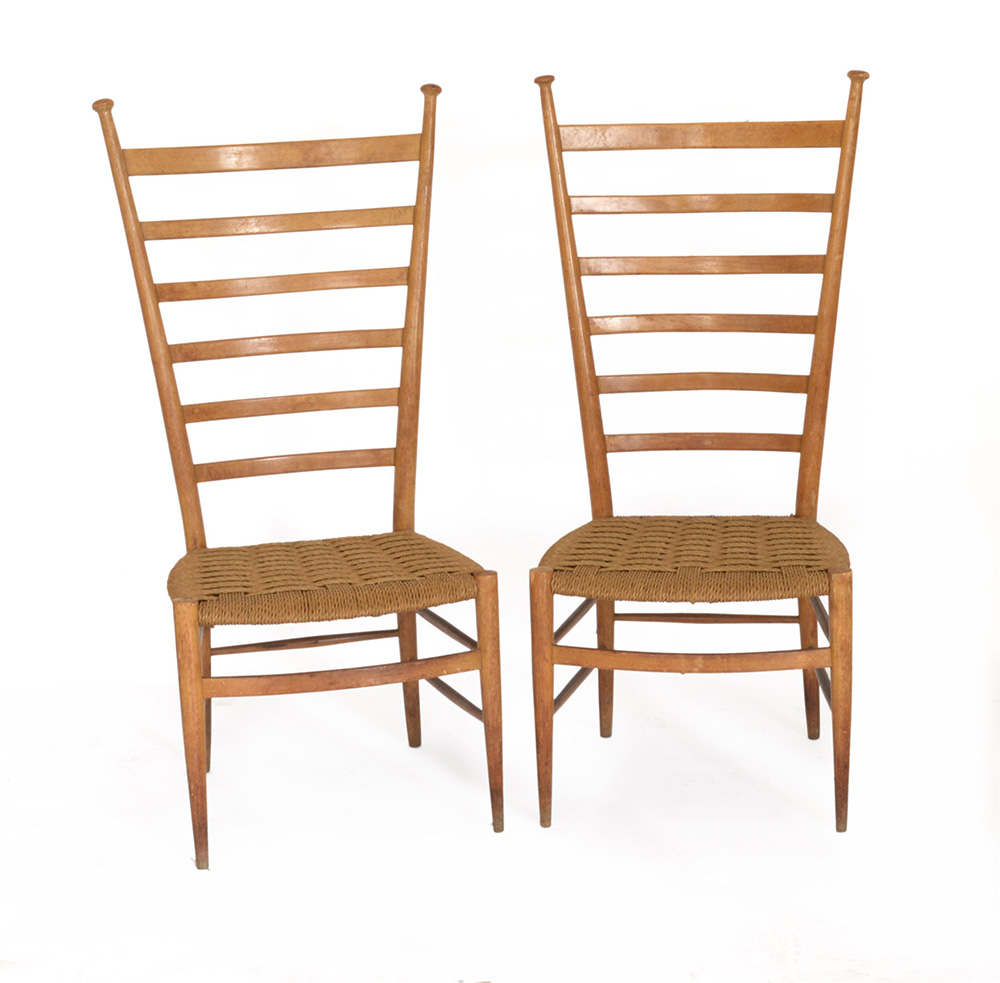 Coppia di sedie chiavarine da ingresso. Chiavari, anni '40. Struttura in legno di frassino con schienale alto a giorno a listelli orizzontali, gambe tornite e rastremate, seduta bassa impagliata. (difetti)